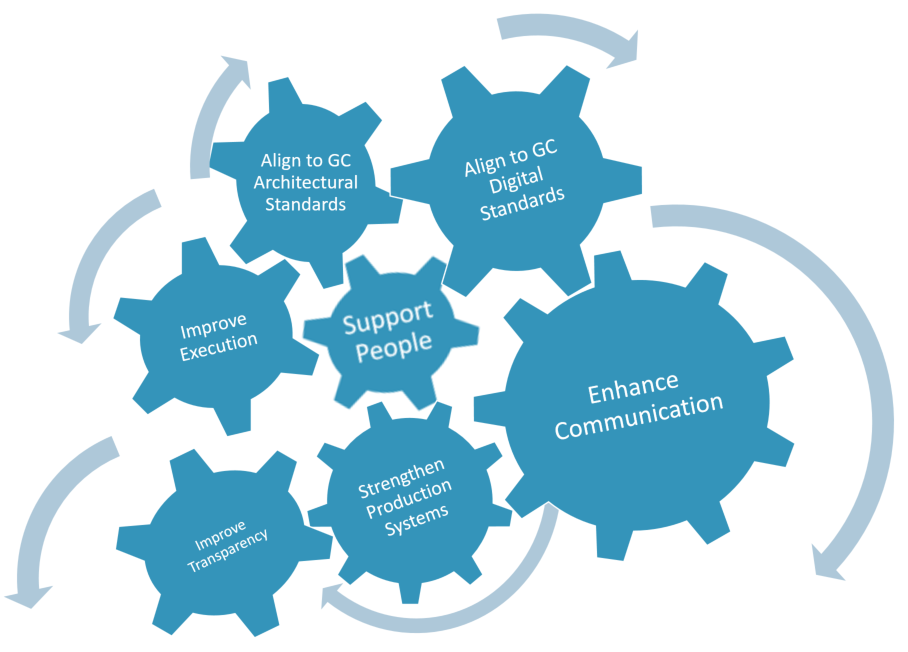 Cogwheel flowchart with seven interlocking circular gears depicting the interconnected, dependent factors that determine the success of the PSC's IM/IT Strategy. From left to right the seven gears can be read as: Improve Transparency, Improve Execution, Align to GC Architectural Standards, Support People, Strengthen Production Systems, Align to GC Digital Standards, Enhance Communication.