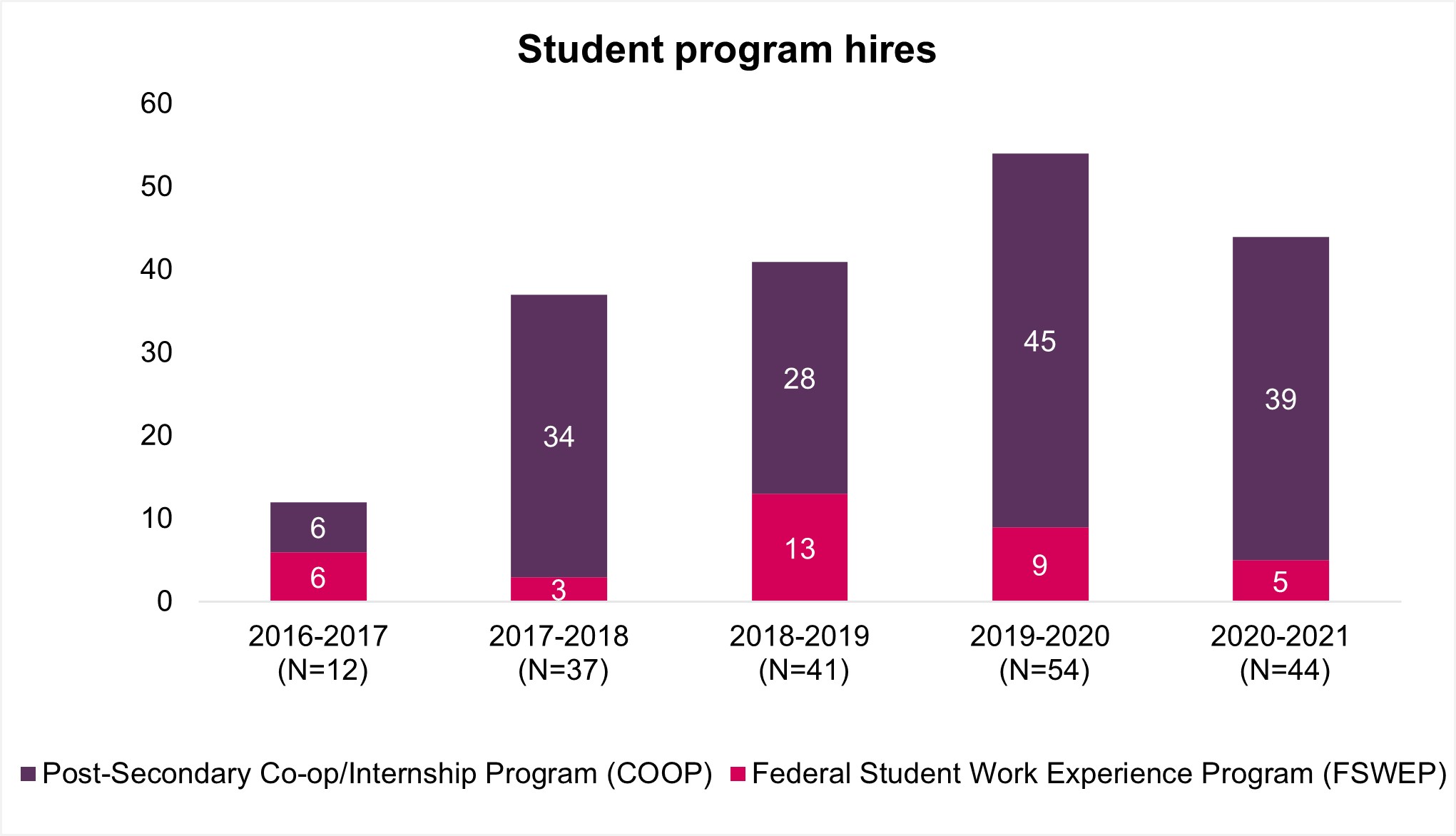 *Hiring of former students includes indeterminate and term hires with experience in a federal student recruitment program within the last 10 years.