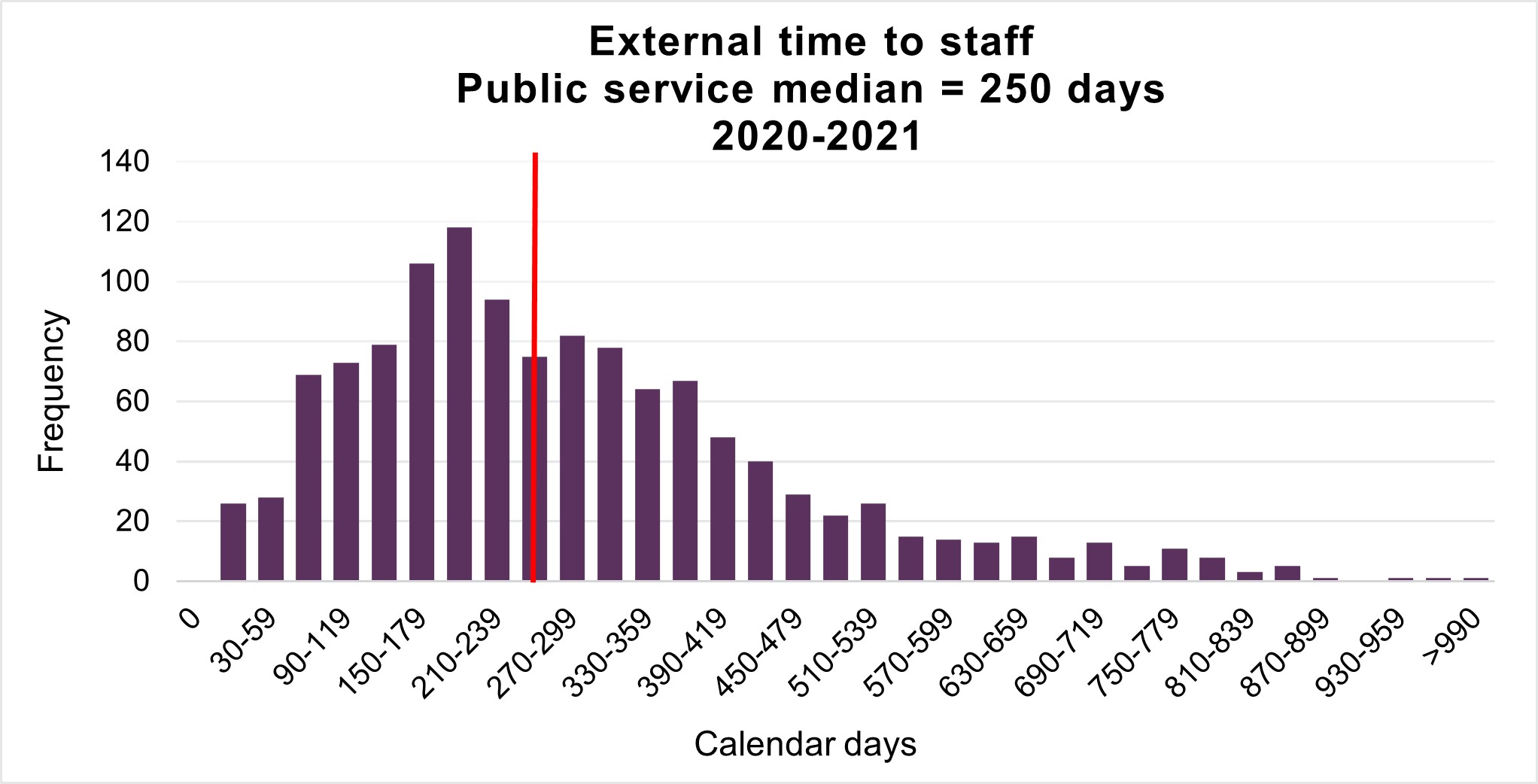 - The Time to Staff for external appointments is the median number of calendar days between the opening date of an external advertisement and the date of the first estimated appointment of an individual from outside an organization subject to the Public Service Employment Act for term and indeterminate positions. Only estimated term and indeterminate appointments/notifications are included (deployments, casual and acting appointments are excluded)