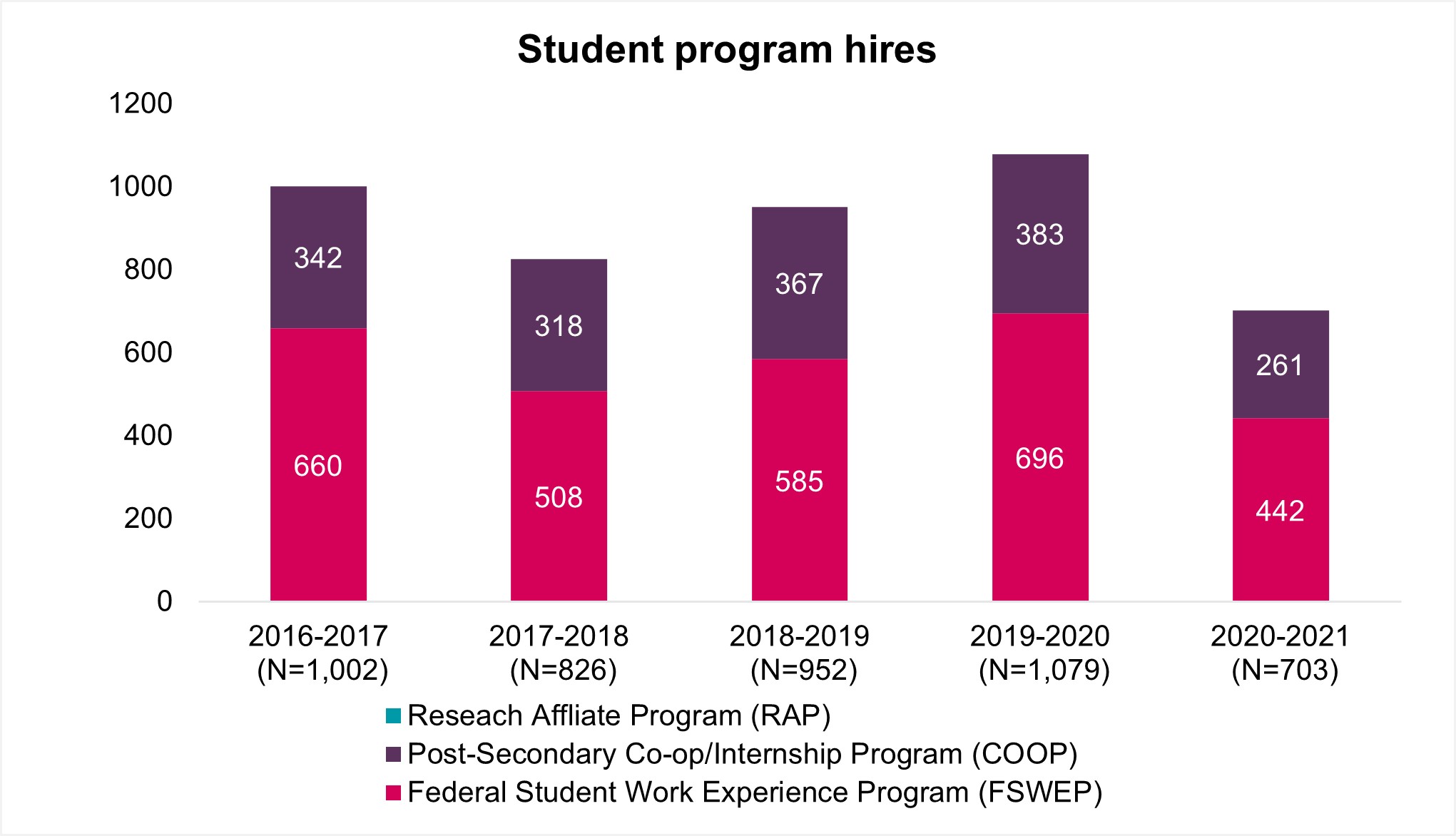 | Fiscal year | Federal Student Work Experience Program | Post-Secondary Co-op/Internship Program | Research Affiliate Program | Total |