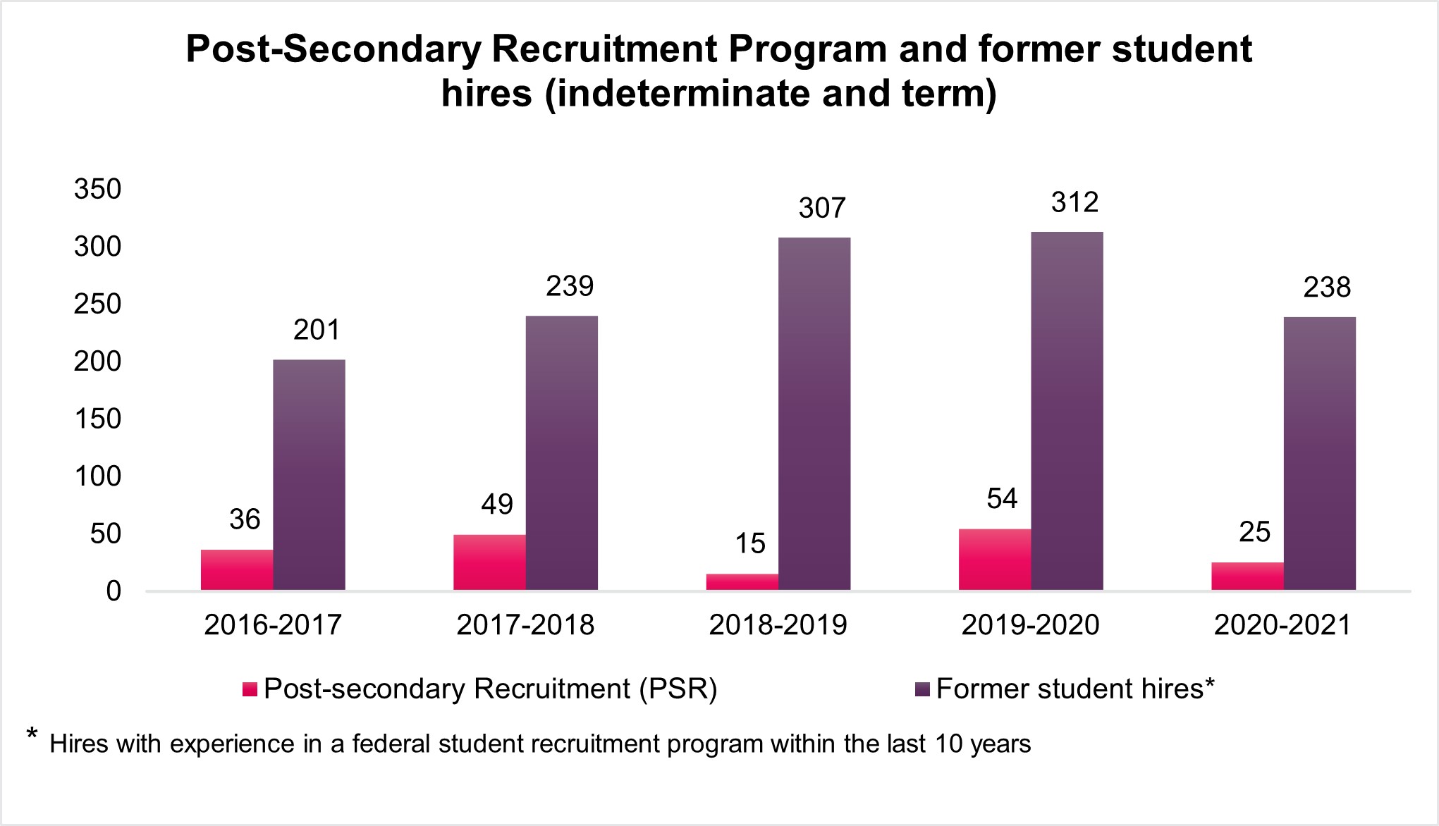 | Fiscal year | Post-secondary Recruitment (PSR) | Former student hires* |
