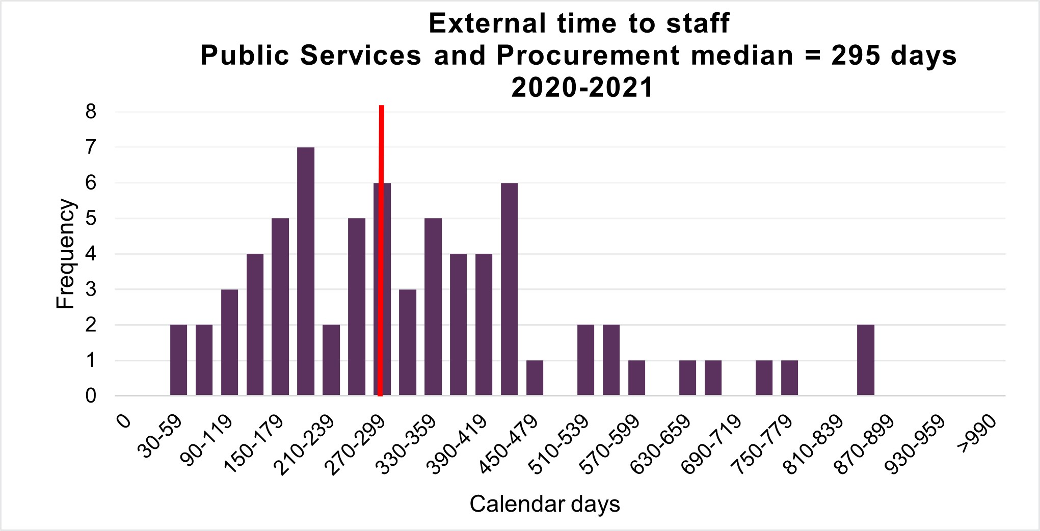 The median external time to staff for the public service (organizations subject to the Public Service Employment Act) for fiscal year 2020-2021 is 250 days. Public Services and Procurement Canada’s median external time to staff for fiscal year 2020-2021 is 295 days.