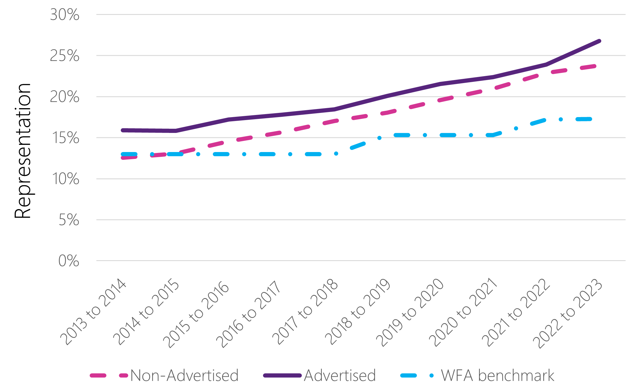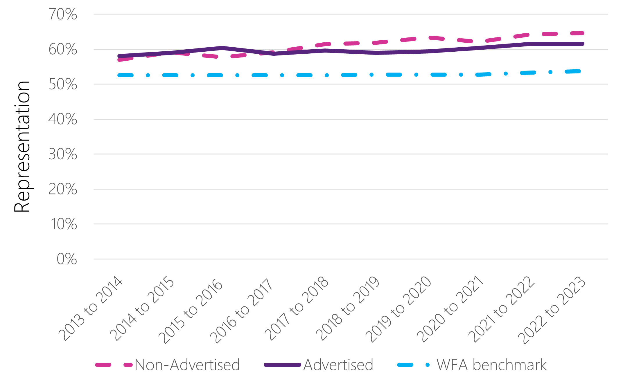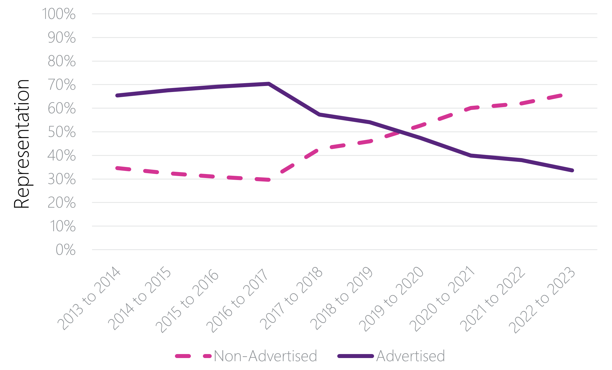 Women’s representation in non-advertised appointments increased from 57.7% in fiscal year 2015 to 2016 to 64.6% in fiscal year 2022 to 2023. By comparison, women’s representation in advertised appointments grew more modestly, increasing from 60.3% in fiscal year 2015 to 2016 to 61.5% in fiscal year 2022 to 2023.