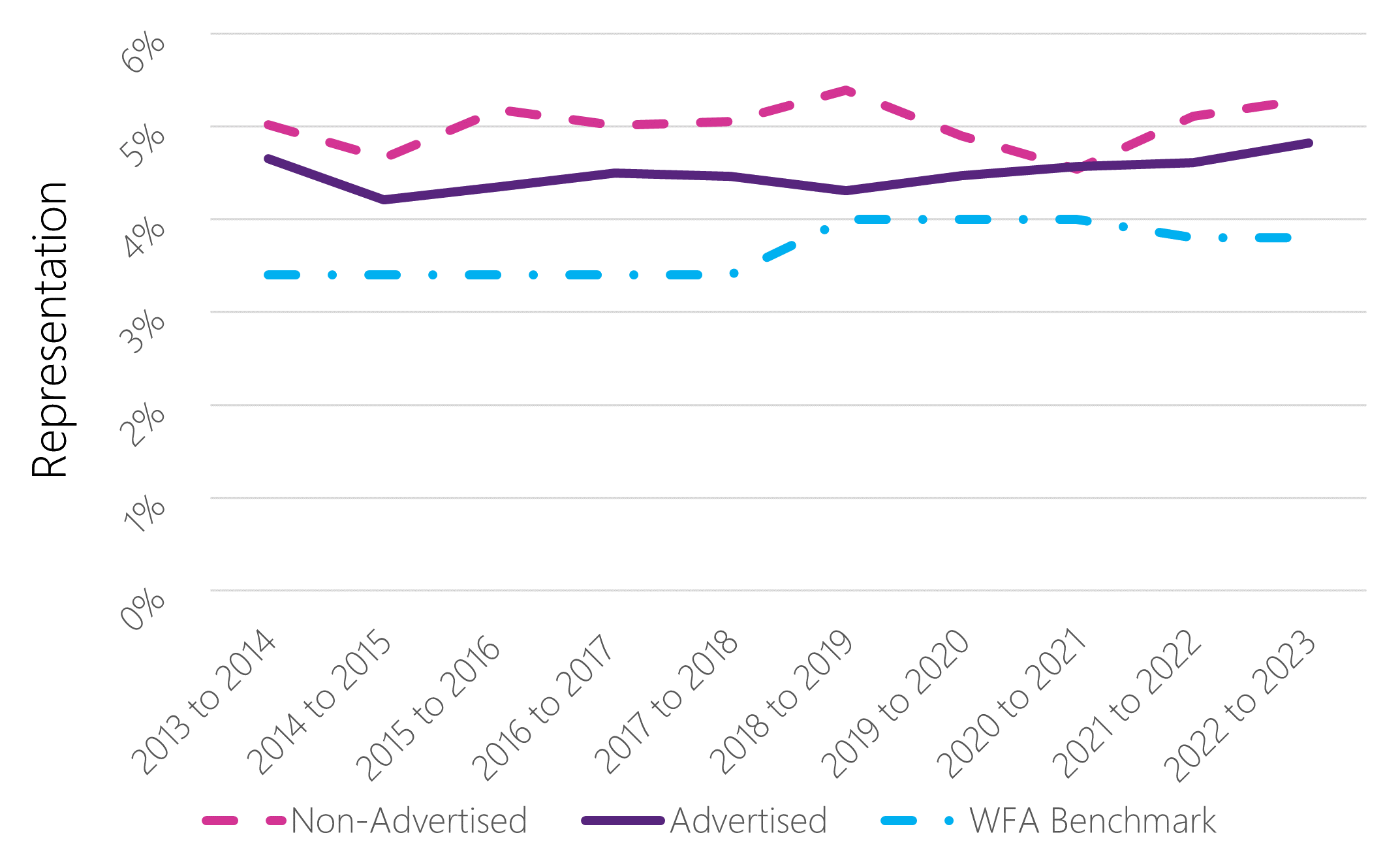 This analysis presents trends in non-advertised versus advertised appointments for fiscal years 2013 to 2023, using fiscal year 2015 to 2016 as a key benchmark for comparison. The results are disaggregated by employment equity group for women, visible minorities and subgroups, Indigenous Peoples, and persons with disabilities. Comparisons are made across time and with WFA benchmarks; see Annex 1 for details on methodology.