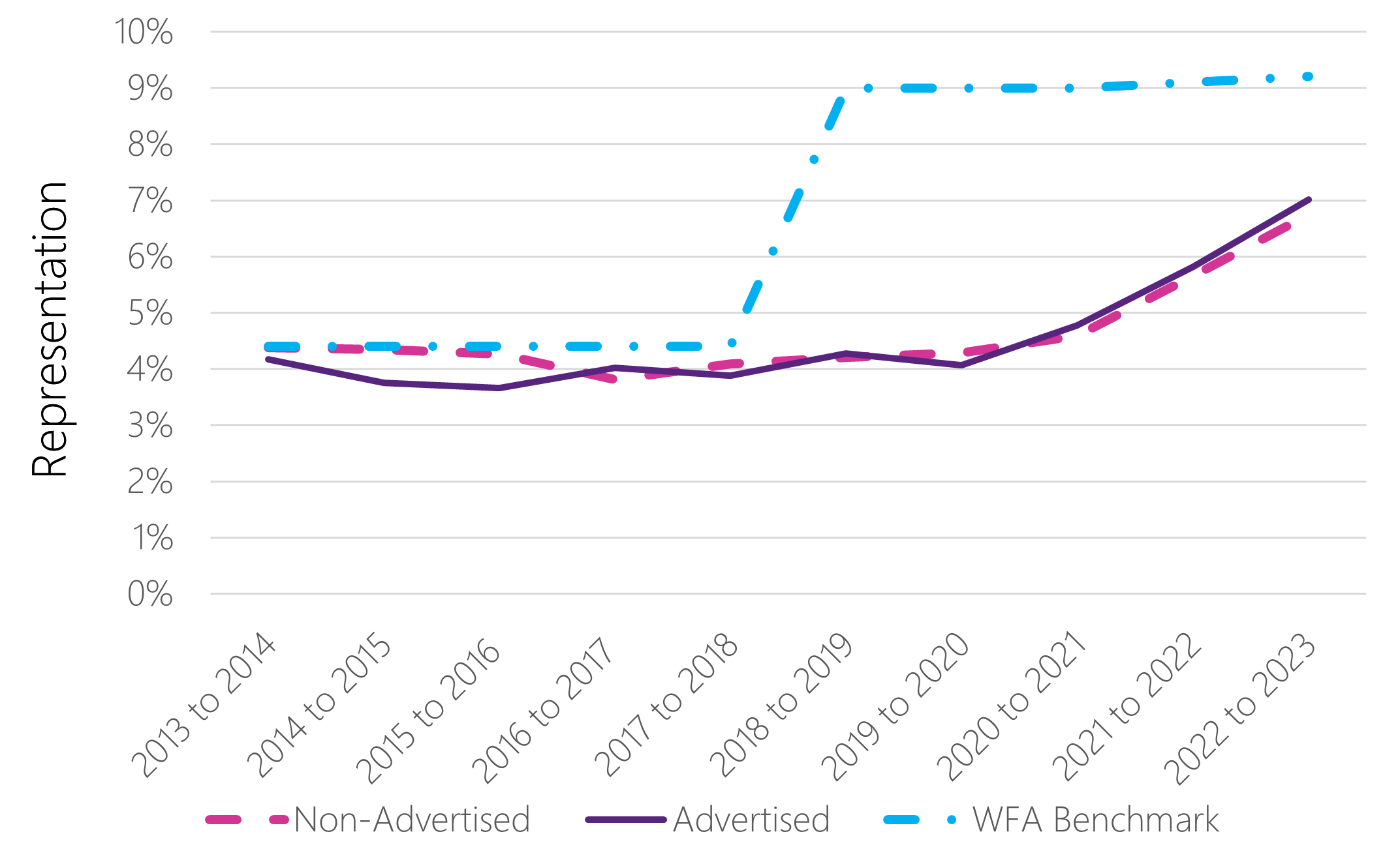 There has been a positive trend in the representation of persons with disabilities in both non-advertised and advertised appointments, particularly since the introduction of the Accessibility Strategy for the Public Service of Canada in 2019. In fact, persons with disabilities’ representation in non-advertised appointments increased from 4.3% in fiscal year 2015 to 2016 to 6.8% in fiscal year 2022 to 2023. Similarly, for advertised appointments, their representation grew from 3.7% in fiscal year 2015 to 2016 to 7.0% in fiscal year 2022 to 2023. While persons with disabilities’ representation has improved, it continues to be below the WFA benchmark.Footnote 4
