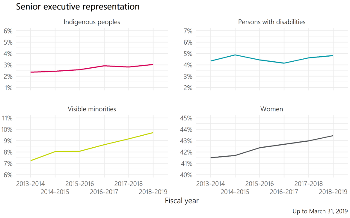 - Although employment equity representation for senior executives falls below workforce availability, representation has generally been increasing since 2014.