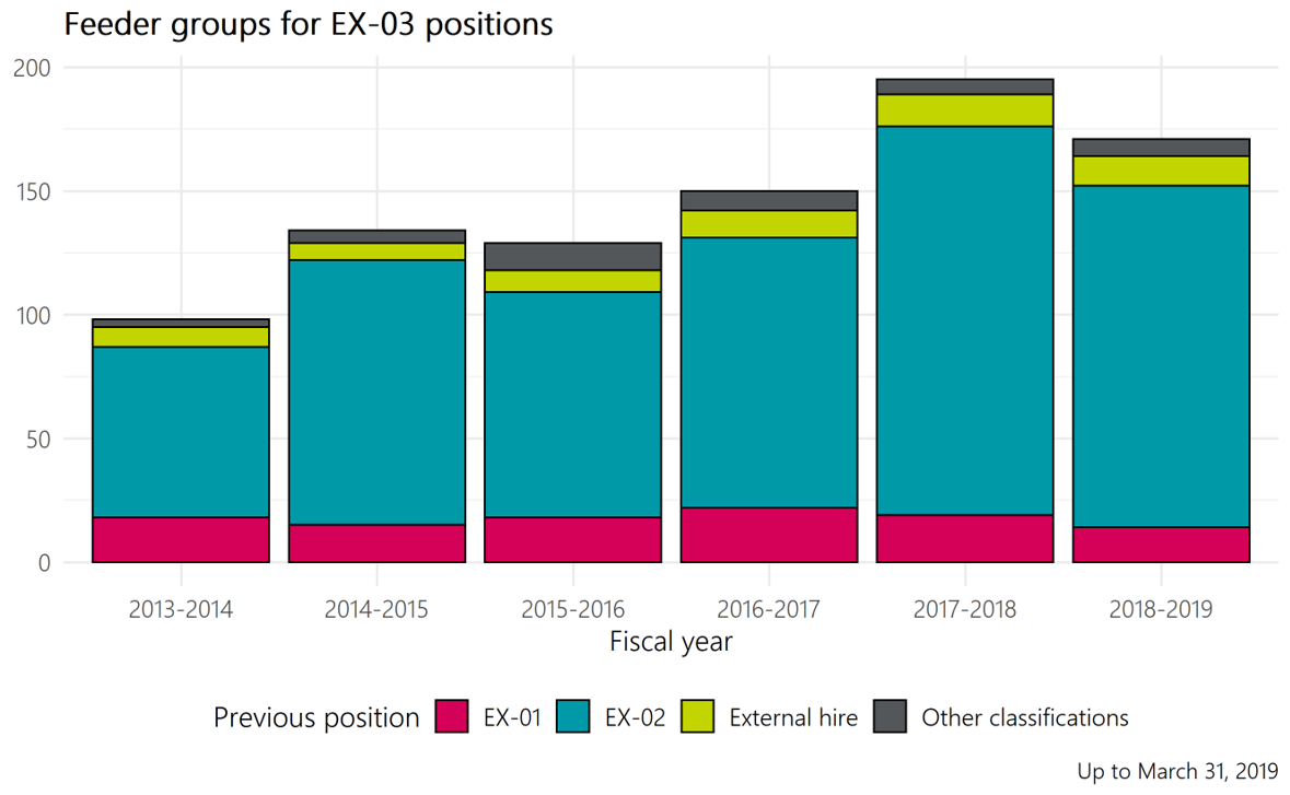 - Since 2014, over three quarters of newly appointed EX-03s came from an EX-02 position. Roughly 11% came from an EX-01 position, and under 7% were hired from outside government.