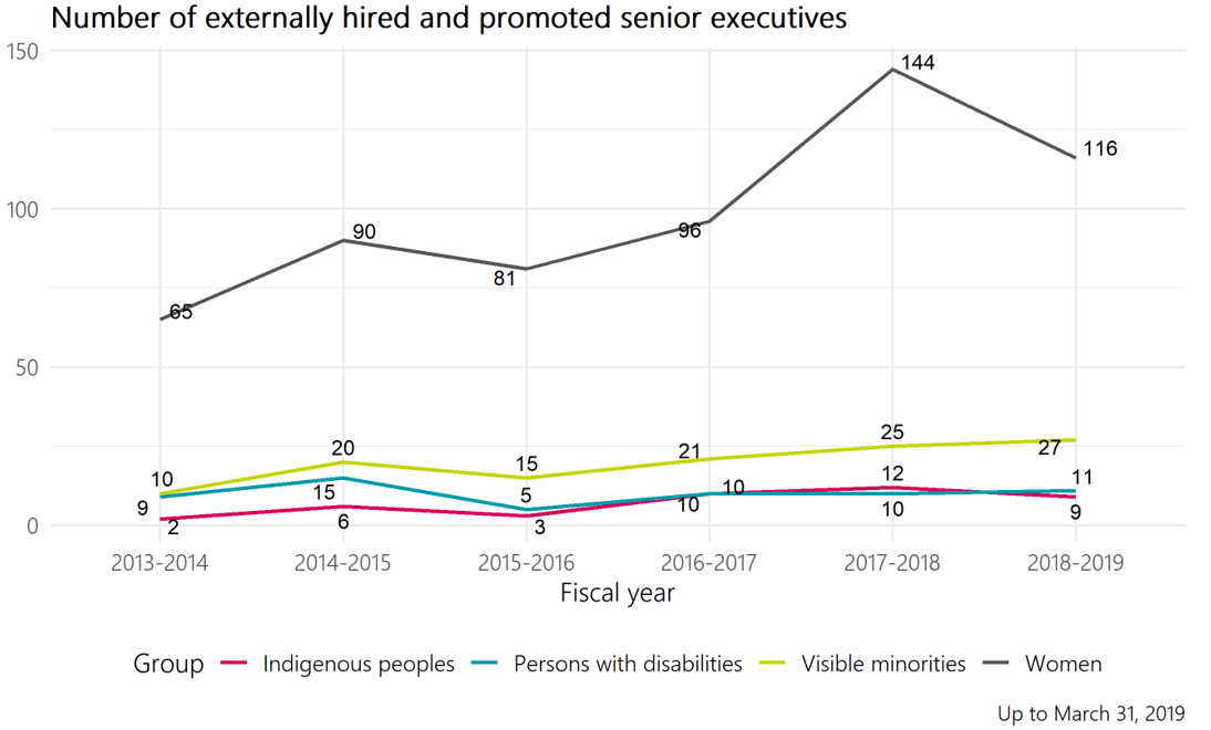 - Within all employment equity groups in 2018-2019, the number of newly appointed senior executives exceeded the number of departures. The table below illustrates the difference between inflows and outflows for senior executives: