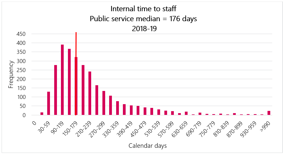 The median internal time to staff for the public service (organizations subject to the Public Service Employment Act) for fiscal year 2018 to 2019 is 176 days. Environment and Climate Change Canada’s median internal time to staff for fiscal year 2018 to 2019 is 202 days.