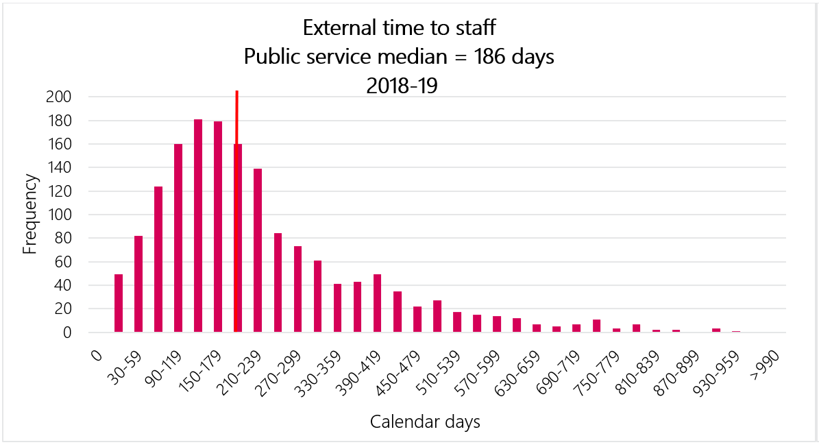 The median external time to staff for the public service (organizations subject to the Public Service Employment Act) for fiscal year 2018 to 2019 is 186 days. Environment and Climate Change Canada’s median external time to staff for fiscal year 2018 to 2019 is 195 days.