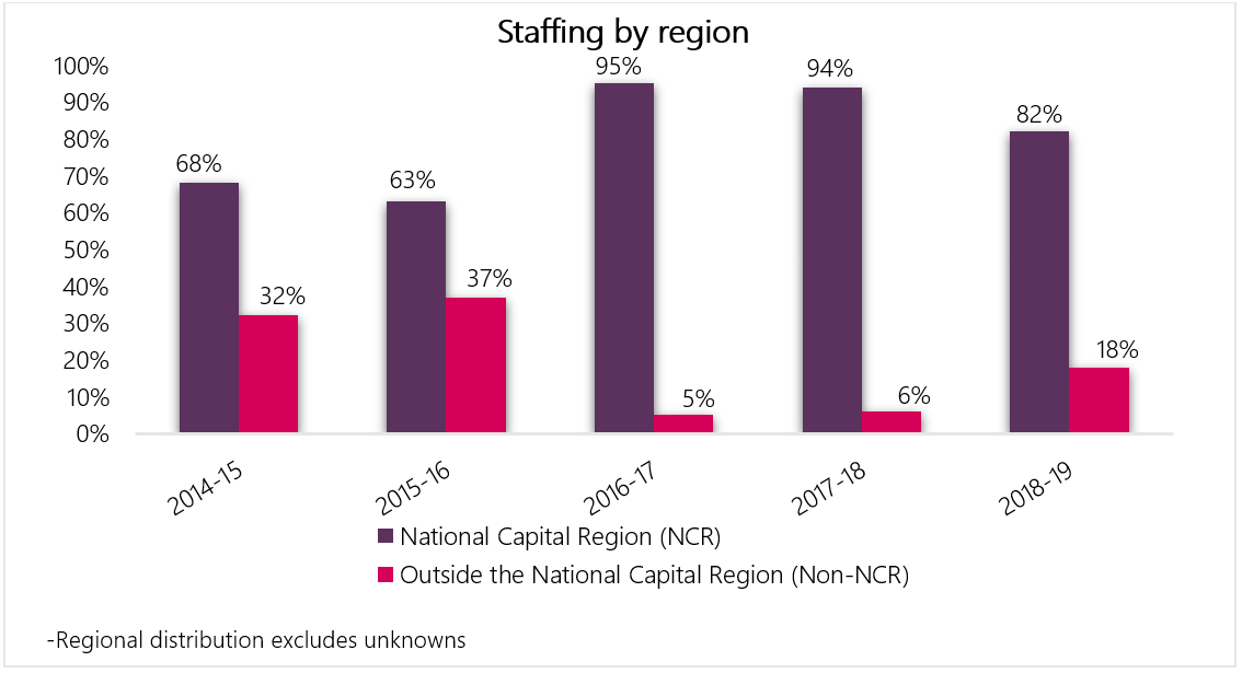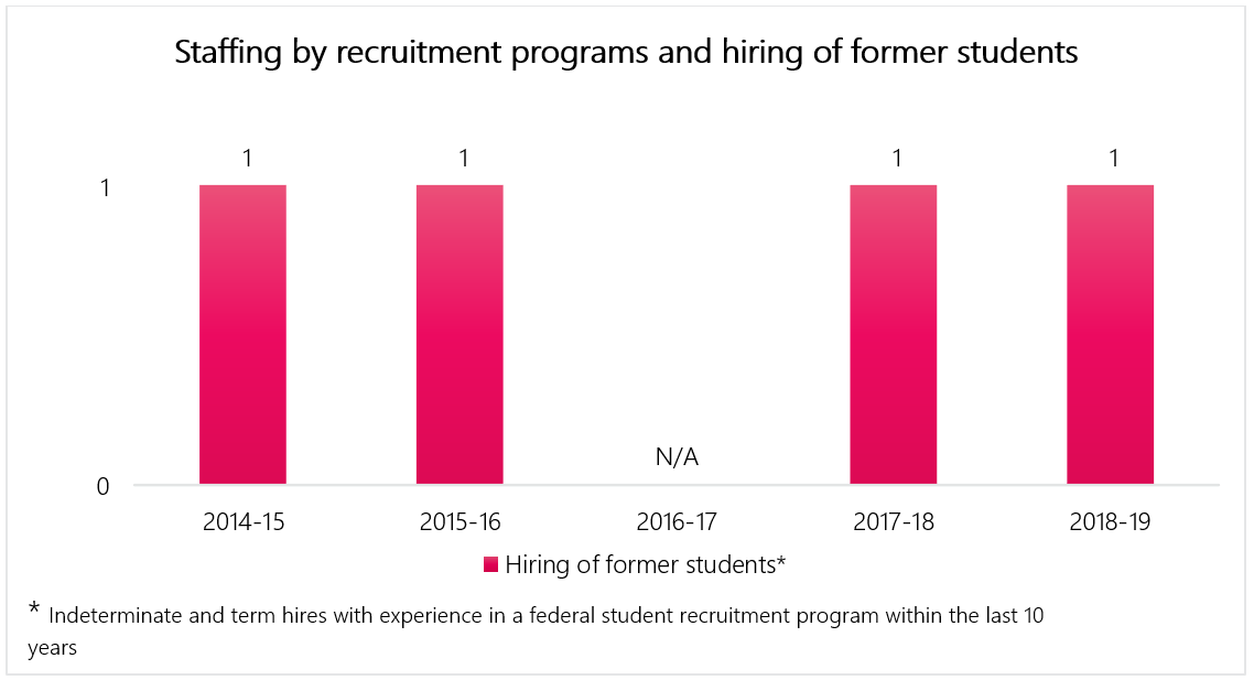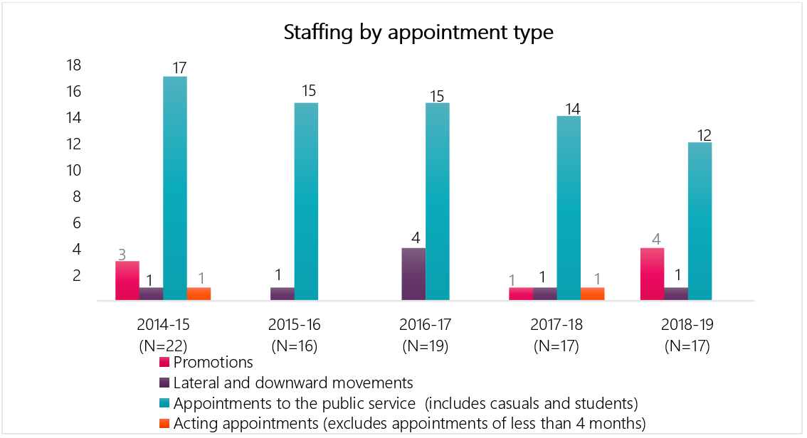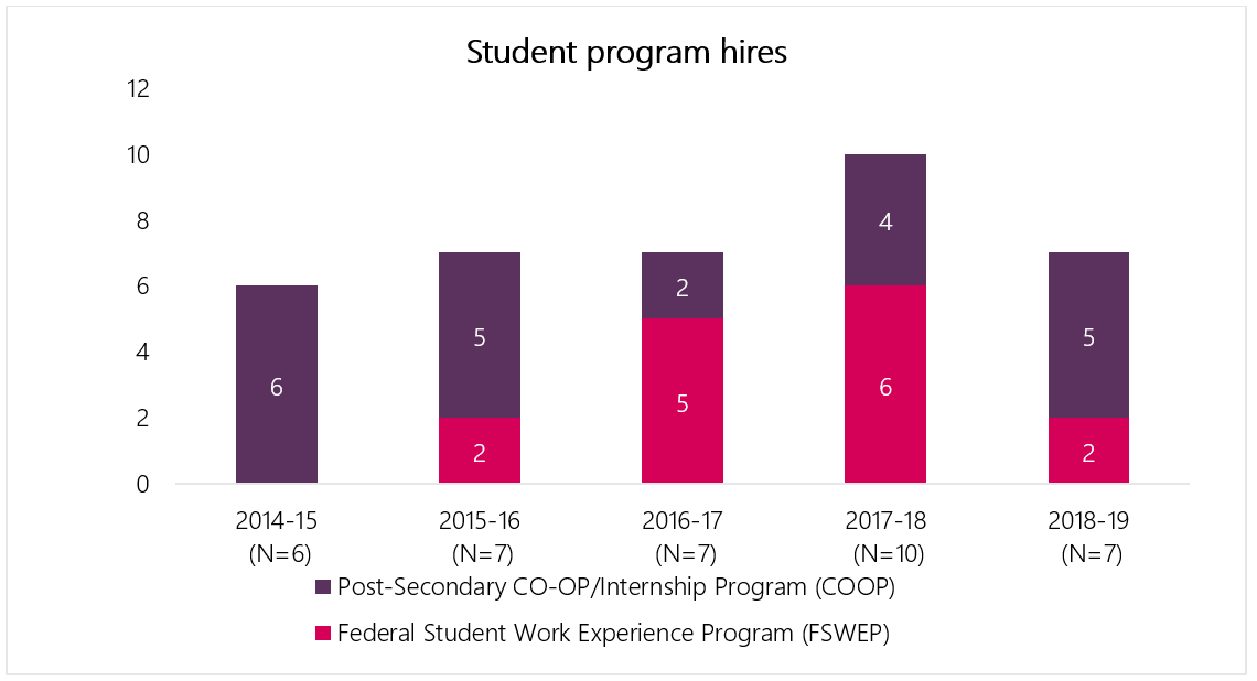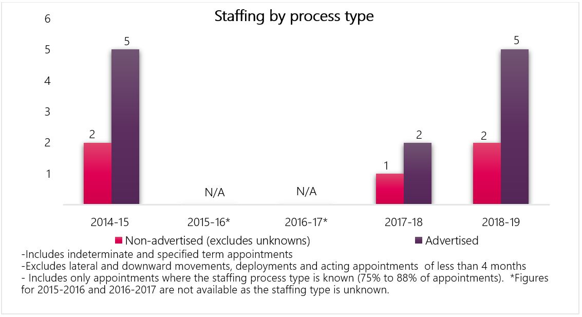 In the 2018–2019 fiscal year, the organization performed 17staffing actions through its service provider, Public Service and Procurement Canada, detailed as follows: