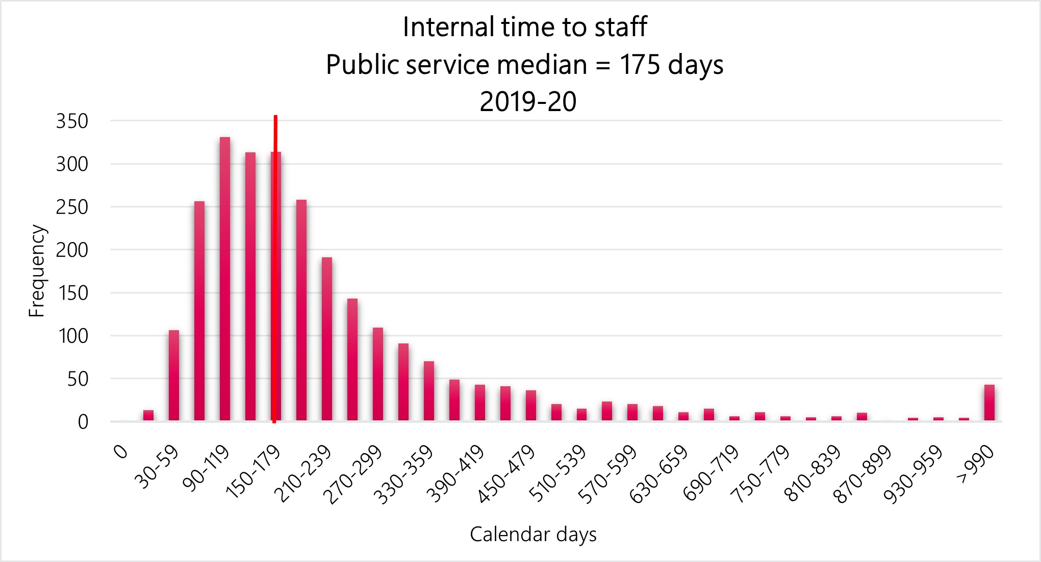 The median internal time to staff for the public service (organizations subject to the Public Service Employment Act) for fiscal year 2019 to 2020 is 175 days
