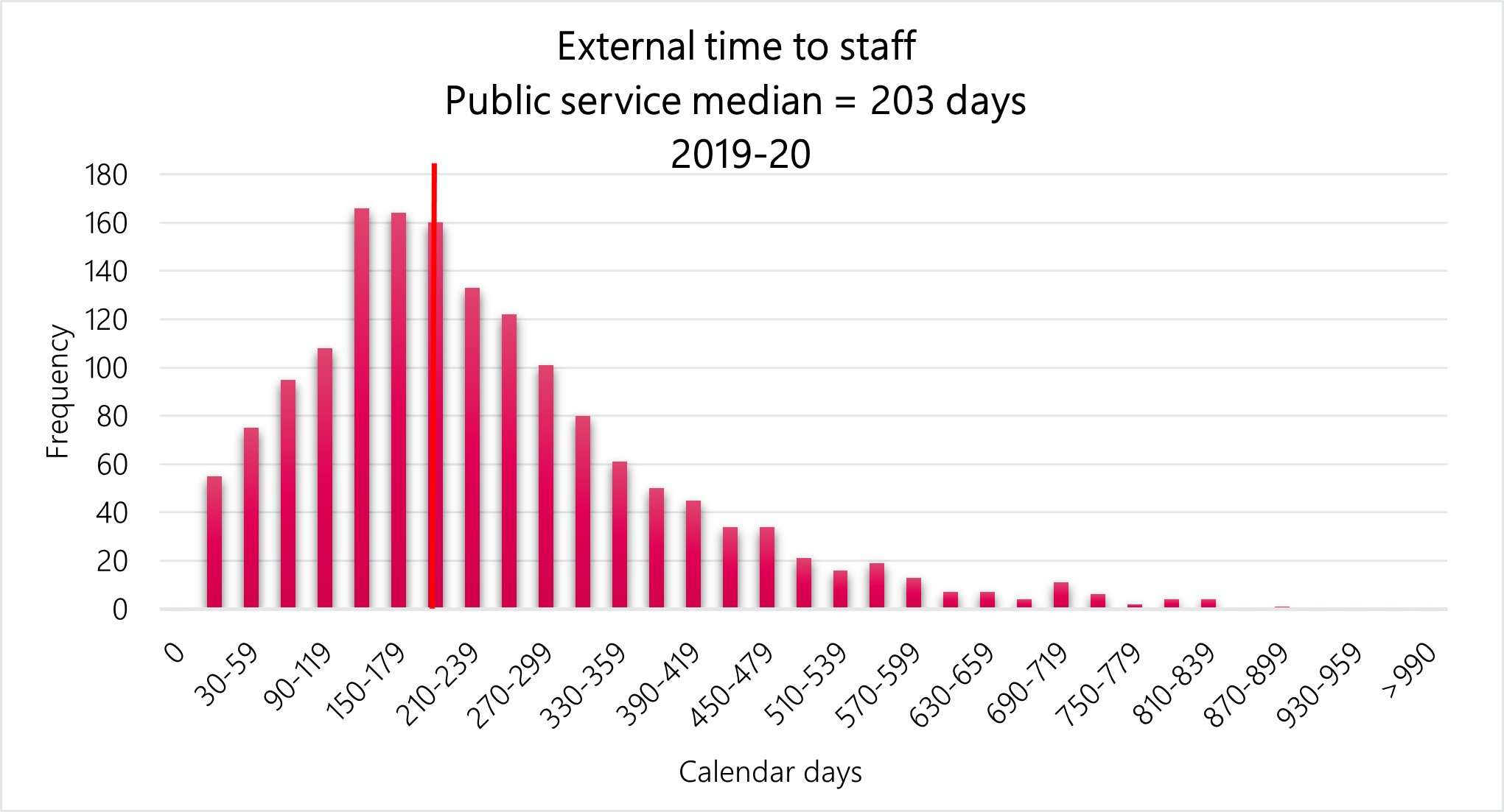 The median external time to staff for the public service (organizations subject to the Public Service Employment Act) for fiscal year 2019 to 2020 is 203 days
