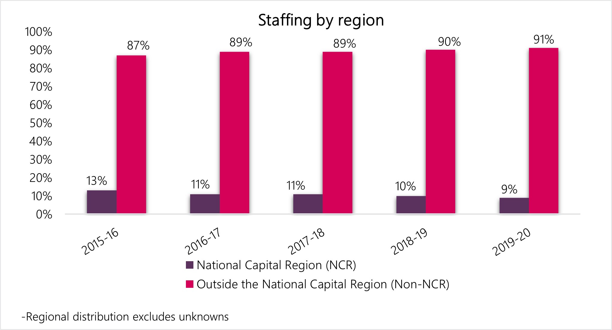 The highly specialized scientific workforce of the Agency brings some challenges when staffing and recruiting. Maintaining talent, especially in the Agency’s headquarters located in Saint-Hubert, Quebec, has been challenging as the organization aims to significantly increase its workforce to deliver on its mandate. More specifically, increased capacity is needed to support large-scale projects, such as the Lunar Gateway, where Canada is partnering with the United States to send human beings deeper into space than they have ever been.