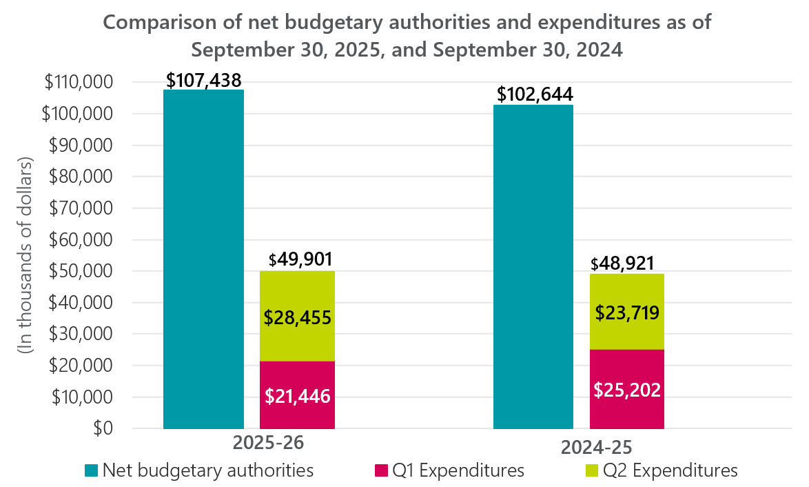 The following graph provides a comparison of the net budgetary authorities available for spending and the expenditures for the quarters ended September 30, 2025, and September 30, 2024, for the PSC’s combined Vote 1 – Program Expenditures and Statutory Authorities.