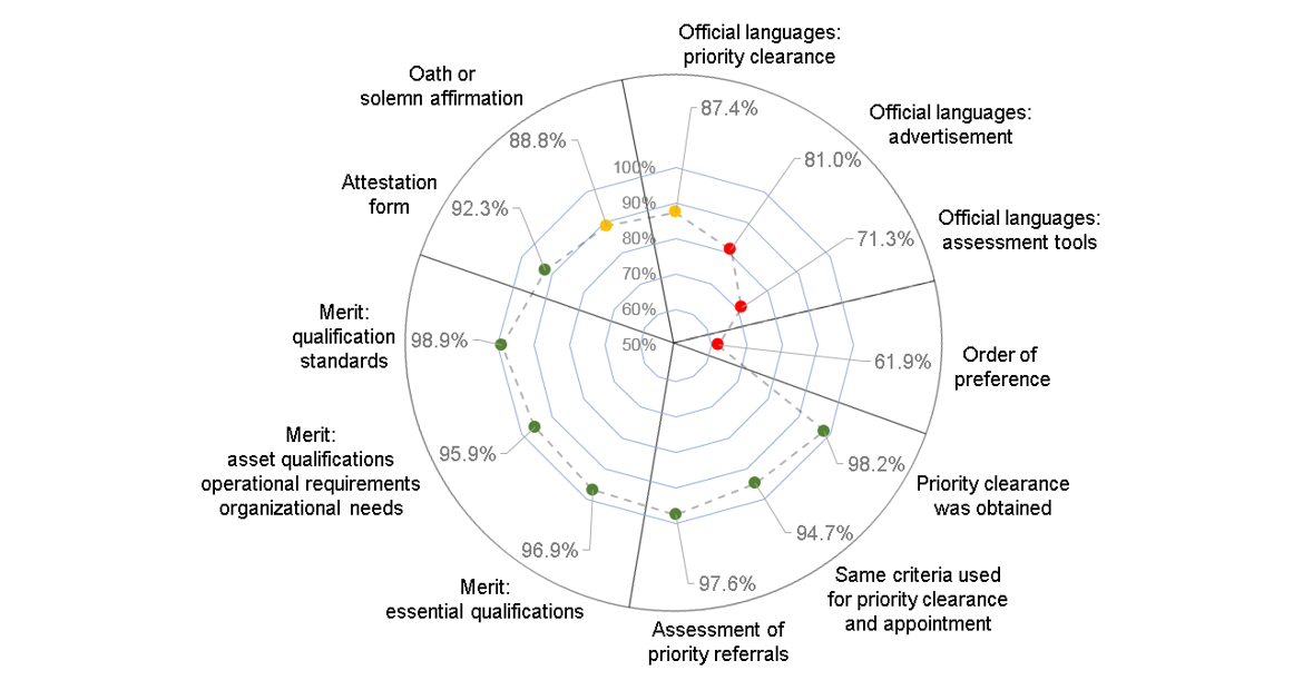 Despite these positive results, the audit also revealed areas for improvement. As shown in Figure 1, official languages requirements, with compliance rates ranging between 71.3% and 87.4%, as well as requirements relating to order of preference (61.9% compliance) are 2 areas where improvement is needed.