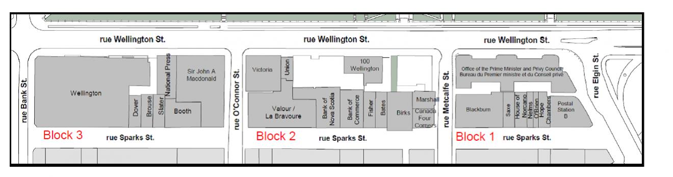 - block 1 is located block between Metcalfe and Elgin streets, and includes the following buildings: Blackburn, Saxe, House of Norcano, Nelms, O’Brien, Hope Chambers, Postal Station B, and the Office of the Prime Minister and Privy Council