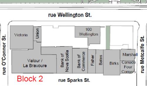 A map of Block 2 which is located between Wellington, O’Connor, Sparks and Metcalfe streets.