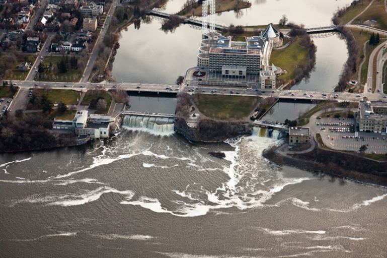 The Rideau Falls Dam Complex consists of 2 concrete dams constructed in the 1800s to manage water levels on the Rideau River: