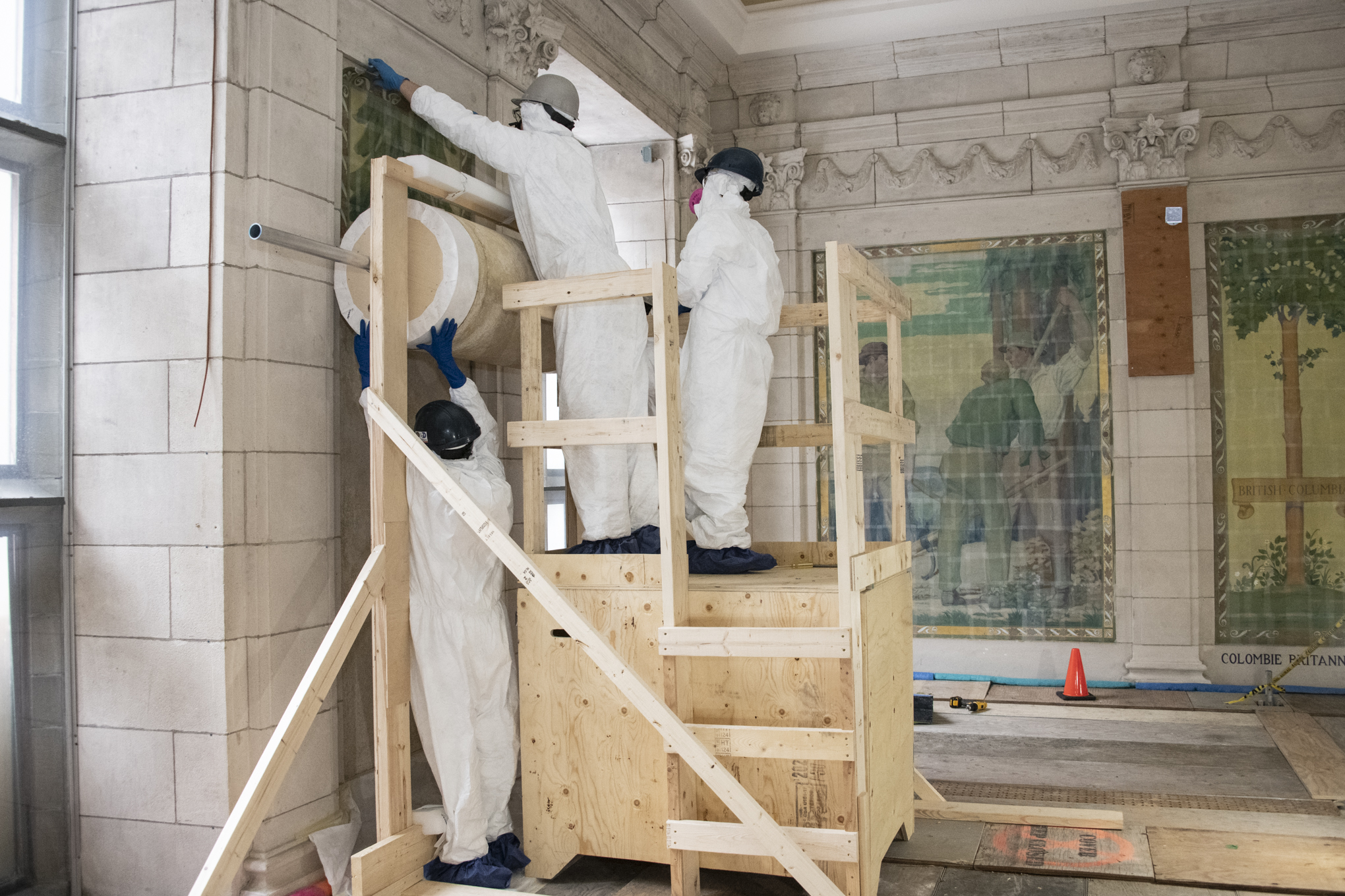 Fine art conservators carefully remove the murals in the former Reading Room. Mural artist Arthur Crisp painted the 17 panels in the early 1920s.