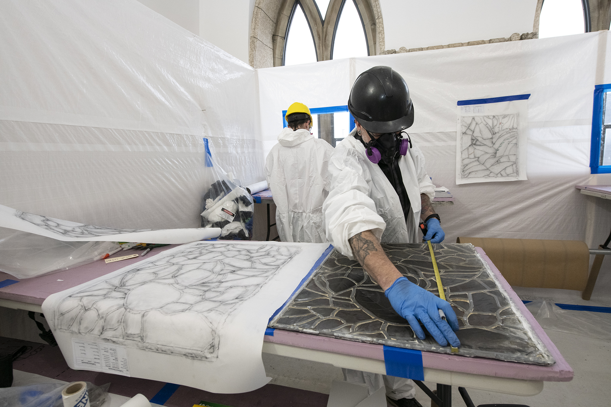 Conservators trace, photograph and assess stained-glass windows removed from the House of Commons Chamber. The stained glass is being packed and will be cleaned and repaired as part of the Centre Block project.