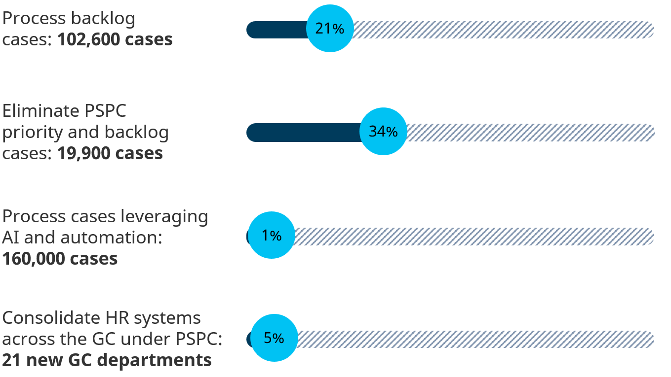- Processing 19,900 PSPC priority and backlog cases (55% complete)—In preparation for testing of Dayforce, PSPC is committed to processing 19,900 outstanding pay cases that PSPC employees had as of April 2025. This effort will help ensure PSPC has no pay cases older than 1 year old when it is ready to onboard to Dayforce.