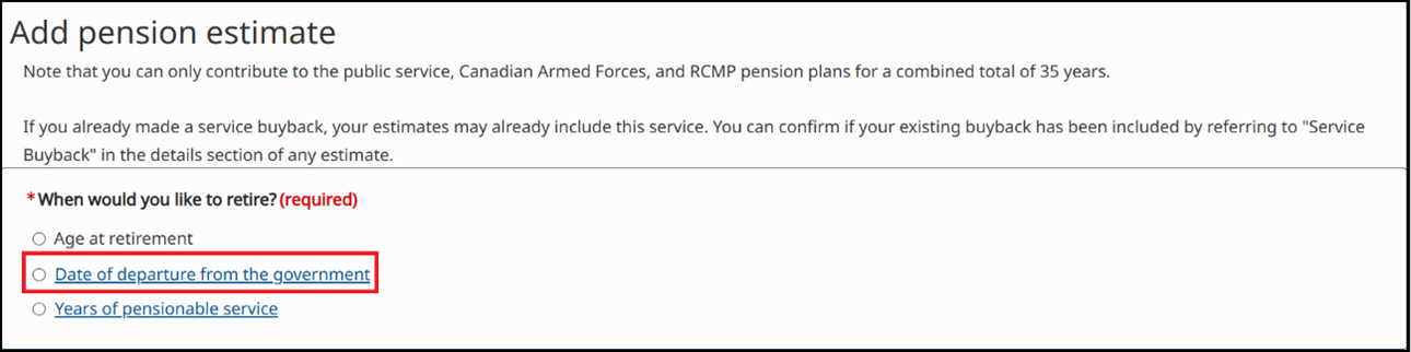 - Following “When would you like to retire?”, select the circle for the option “Date of departure from the government”