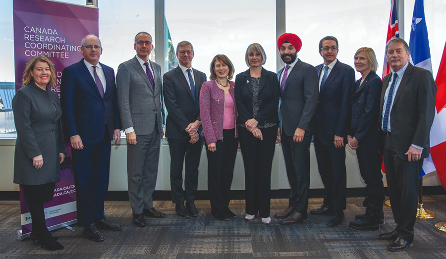 CRCC members with the Minister of Health and the former Minister of Innovation, Science and Industry, January 30, 2020. Left to right: Catherine MacLeod (Executive Vice-President at CIHR, delegate for Michael Strong), Iain Stewart, Simon Kennedy, Stephen Lucas, Mona Nemer, the Honourable Patty Hajdu, the Honourable Navdeep Bains, Alejandro Adem, Roseann O’Reilly Runte, Ted Hewitt. Photo credit: ISED