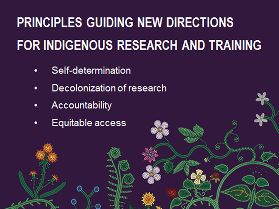 This image of Indigenous floral beadwork on a purple background illustrates the four principles guiding the new directions for Indigenous research and training. The principles are self-determination, decolonization of research, accountability and equitable access.
