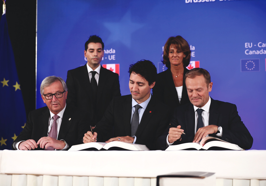Prime Minister Justin Trudeau and Donald Tusk, the former President of the European Council, sign the Canada-European Union Summit Joint Declaration on July 18, 2019, recognizing the importance of research collaboration and welcoming support, through the New Frontiers in Research Fund, for Canadians participating in international teams funded through Horizon 2020 or Horizon Europe. Photo Credit: Office of the Prime Minister