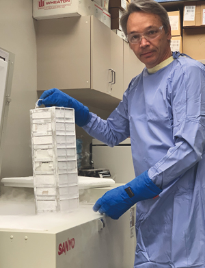 Université Laval’s Professor Louis Flamand chairs the Faculty of Medicine’s Department of Microbiology and Immunology where he leads a NFRF-funded project studying the pathogenesis of COVID-19. At Laval’s Biosafety level 2 lab, Flamand holds a cryo tower of samples preserved at -150°C.