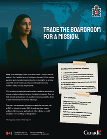 Ready for a challenging career to advance Canada’s national security interest? The Canadian Security Intelligence Service (CSIS) is seeking patriotic, goal-oriented professionals who are looking for an exciting way of life: one of meaning and impact, dedicated to ensuring Canada’s safety, security and prosperity.