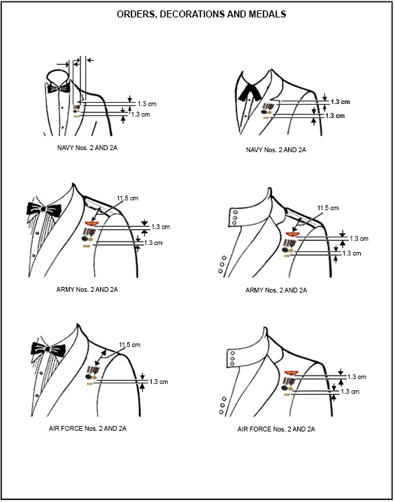 - When orders, decorations, and medals are worn, commendations and other authorized emblems shall not be obscured, and where necessary shall be repositioned lower, 2.6. cm from the bottom of the medals to the top edge of the senior commendation or emblem.