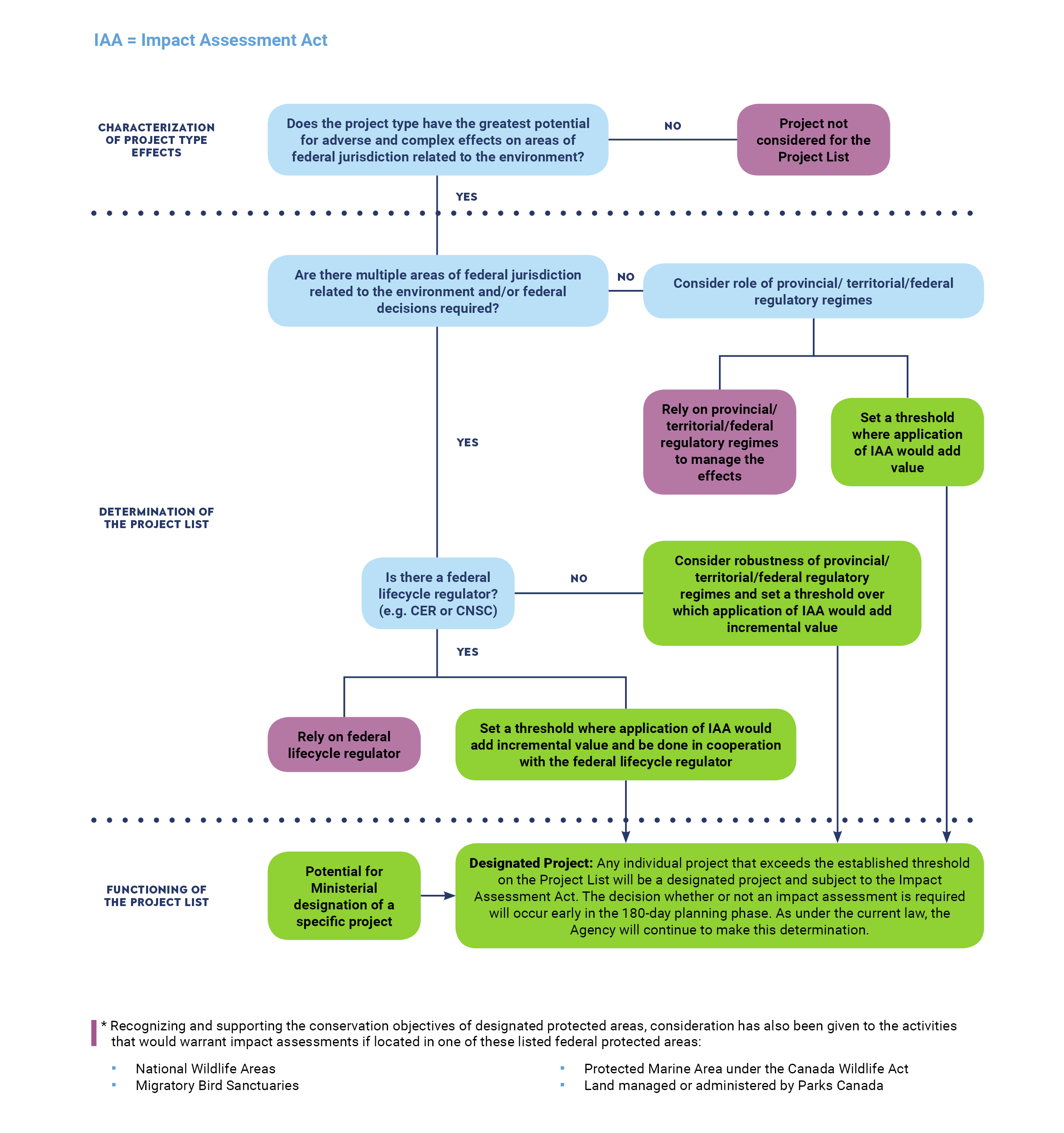 The objective of the Project List is to capture major projects with the greatest potential for adverse effects in areas of federal jurisdiction related to the environment, while also providing certainty and clarity as to which projects are subject to the Impact Assessment Act. In a mature regulatory environment such as Canada, it is intended that federal impact assessments apply only where incremental value can be added, over and above other federal regulatory oversight mechanisms (e.g. permits).