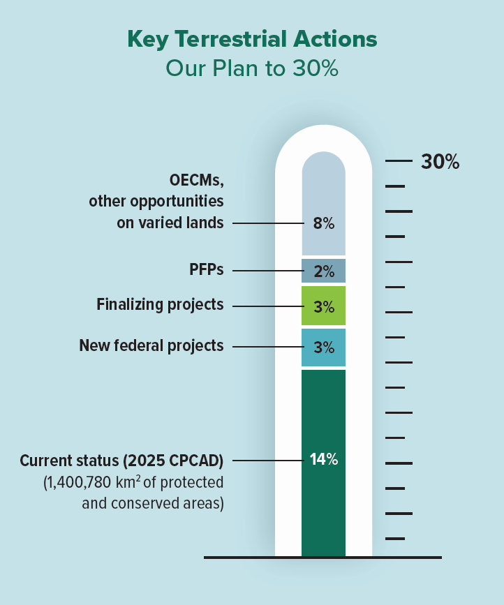 - Add up to 1.7% (97,750 km2) by working with partners to finalize protected areas that previously received Government of Canada funding;