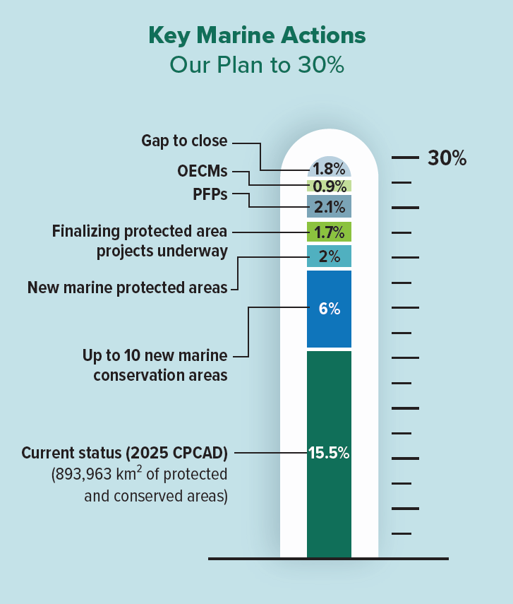 - Add up to 2% (115,000 km²) in new federal marine protected areas;