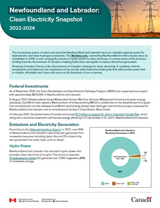 According to the National Inventory Report, in 2022, over 98% of Newfoundland and Labrador's electricity was generated from renewable resources including hydro. Around 2% of electricity was generated from other fuels, such as diesel.