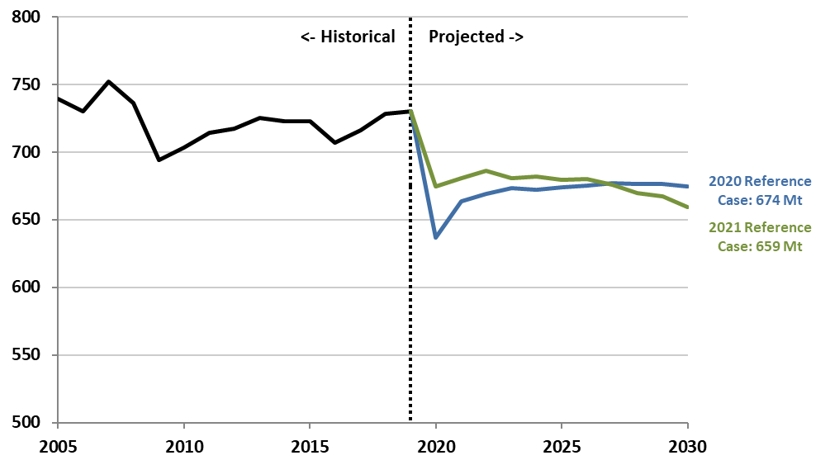 | Year | 2021 National Inventory Report (NIR) historical data | 2020 Reference Case: 674 Mt CO2 eq | 2021 Reference Case: 659 Mt CO2 eq |
