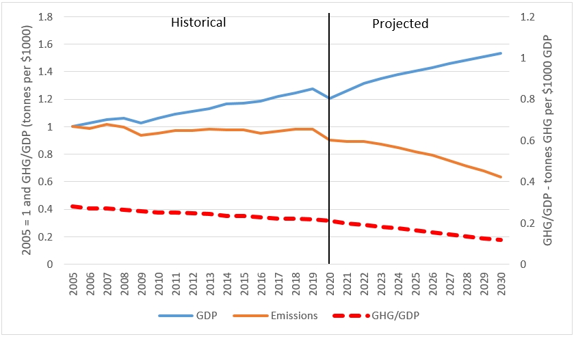 The 2021 Reference Case projections are based on the most recent available baseline data and assumptions. Historical data on Gross Domestic Product (GDP), disposable personal income, consumer price index, population demographics and employment come from Statistics Canada while historical emissions data are provided by the 2021 National Inventory Report (2021 NIR) which includes emissions up to and including 2019. GDP projections out to 2026 are calibrated to Finance Canada's Economic and Fiscal Update 2021 and the GDP projections from 2027 and 2030 are based on Finance Canada's long-term projections.
