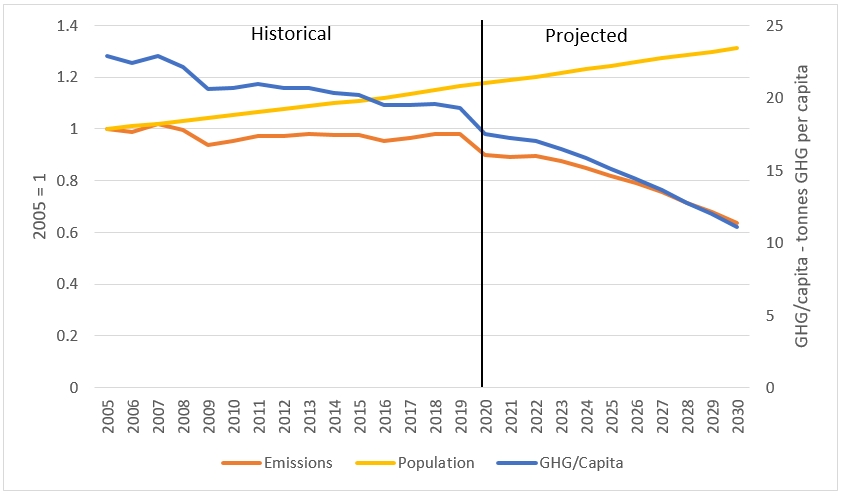 | 2005 (Historical) | 2010 (Historical) | 2015 (Historical) | 2019 (Historical) | 2020 (Projected) | 2030 (Projected) | Change 2005 to 2030 | |