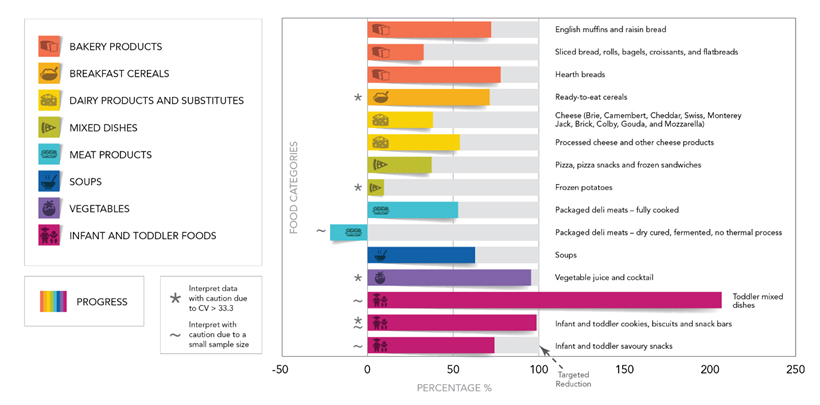 In February 2016, nearly one year in advance of a scheduled comprehensive assessment of the food supply, Health Canada conducted interim monitoring of sodium in select food categories to provide an indicator of industry’s progress towards meeting the sodium reduction targets that Health Canada published in 2012. Fifteen priority food categories were identified based on their importance relative to the sodium intake of Canadians: