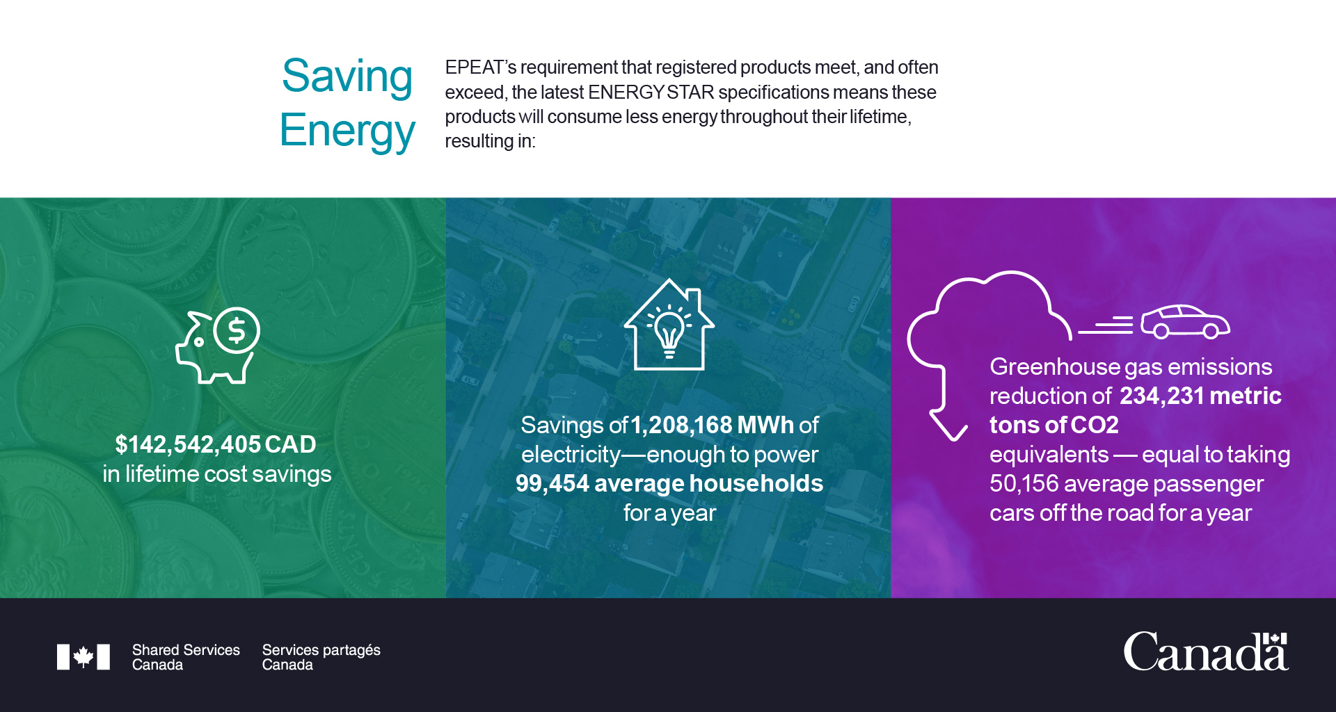 SSC's requirement for EPEAT in IT procurements provides Canadians with benefits that go beyond sustainability. The increased efficiency of EPEAT-compliant IT products purchased from 2014-2020 will save the government more than $142,542,405 million. And over the last six years, SSC procurement of EPEAT-registered IT products: