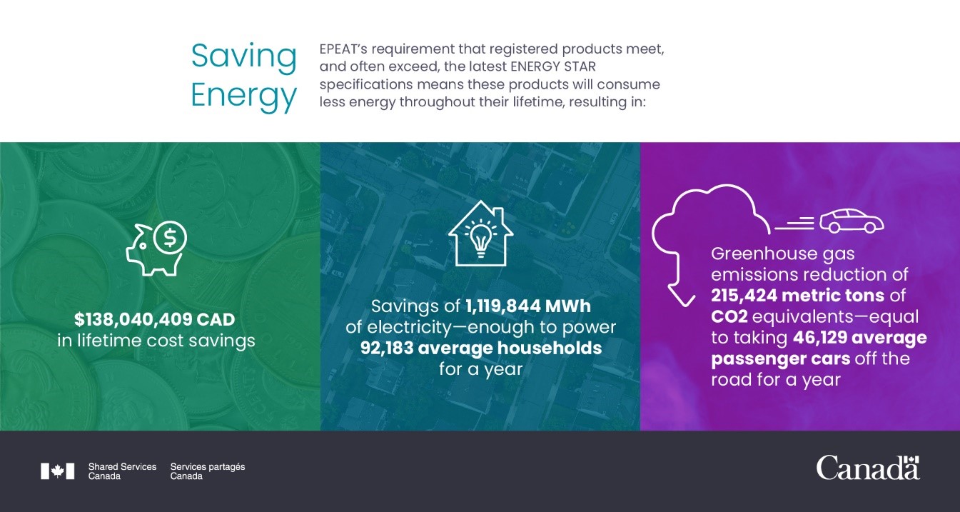 A descriptor text above the 5 columns reads: Over their lifetime, products that do not meet EPEAT criteria, the EPEAT-registered products purchased by Shared Services Canada in 2014-2019, will result in environmental impact reductions including: