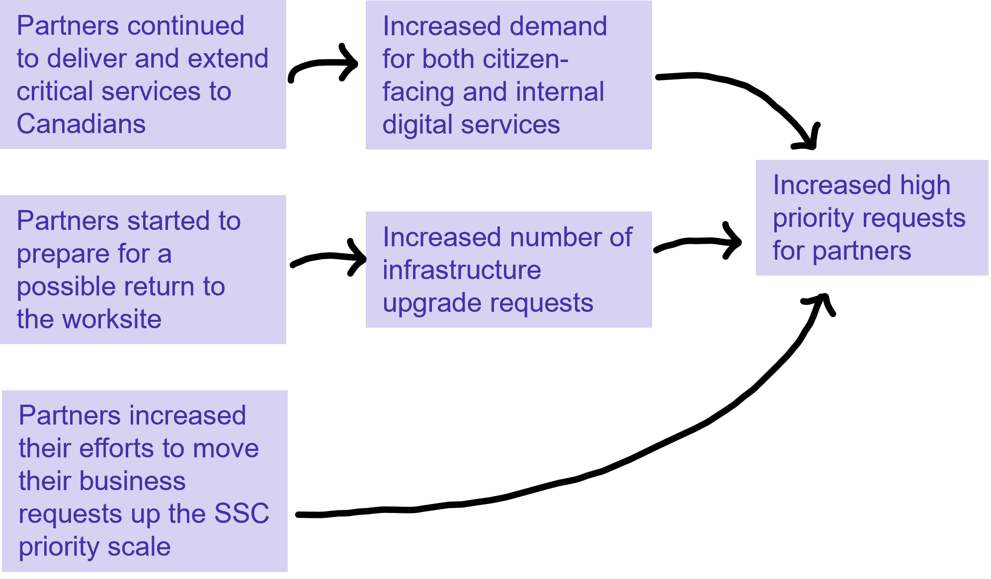 SSC’s COVID-19 response focused on departments and agencies that delivered critical applications and services to Canadians during the pandemic. While this prioritization strategy was effective in meeting the urgent needs and requirements during COVID-19, it disproportionally impacted organizations that perceived themselves as lower priority as they were not directly involved in the pandemic response.
