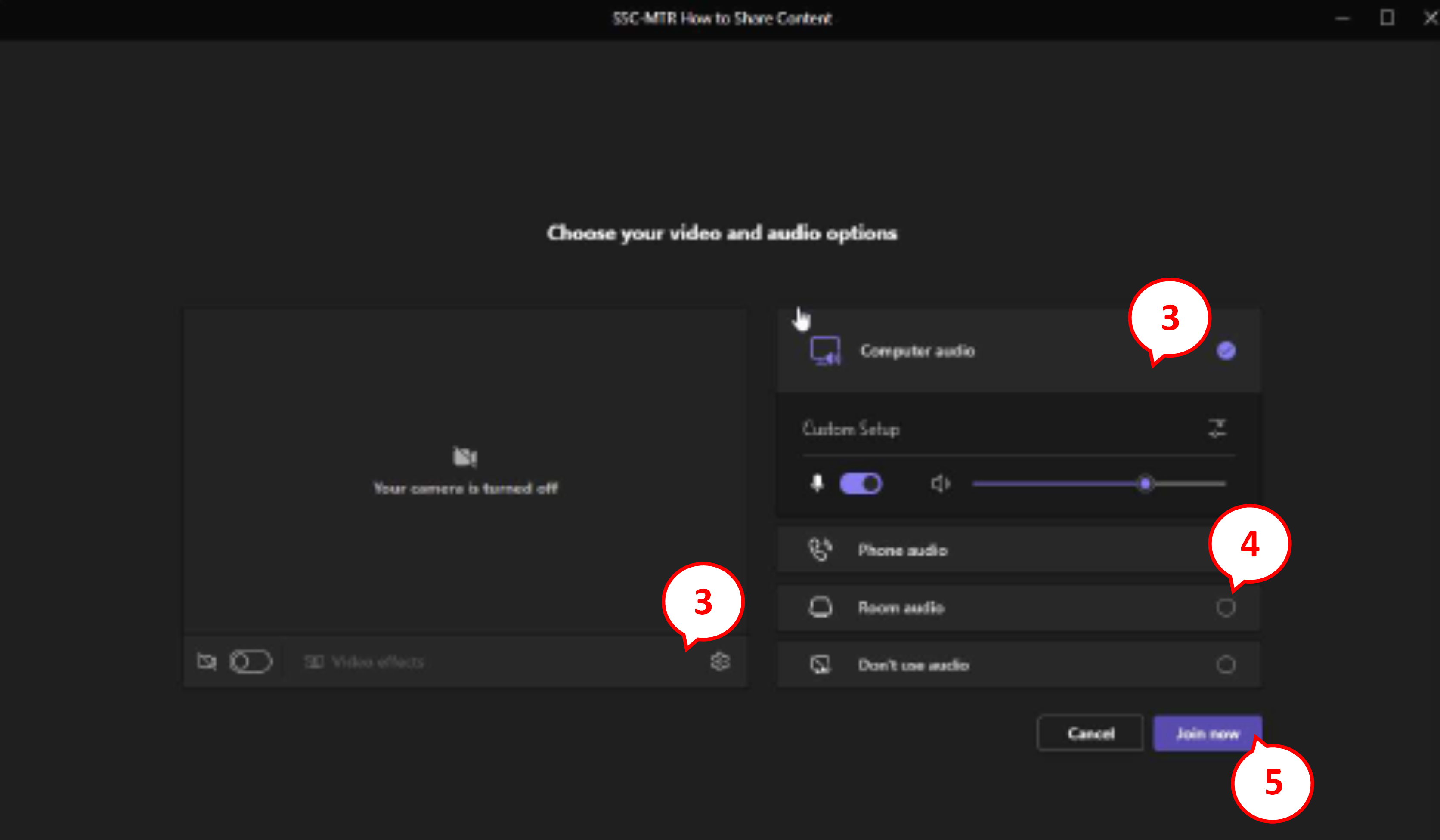 - If you are joining the meeting in a room with an MTR touch-panel device that is also part of the meeting, select the "Room audio" button (4).