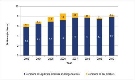 It is estimated that as of December 31, 2012, there had been approximately 204,000 participants in tax shelter donation schemes, with $6.4 billion in donations reported. As of July 2013, the CRA had completed over 182,000 reassessments of taxpayers who had participated in tax shelter gifting arrangements, denying approximately $5.9 billion in charitable donations. Footnote 19