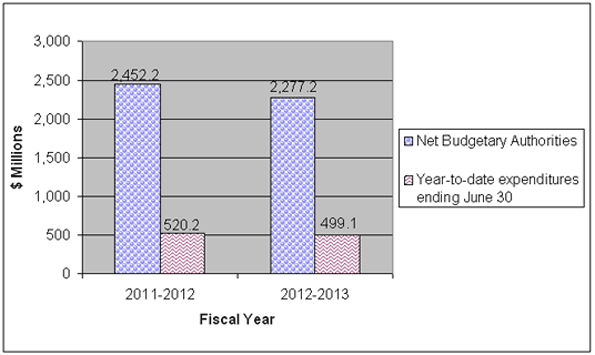 Graph 1 outlines the net budgetary authorities for Vote 1, Program Expenditures, which represent the resources available for use for the year (blue bar) as well as the year-to-date expenditures (red bar).
