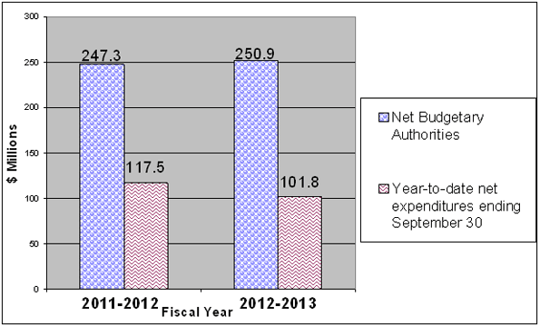 Graph 1 outlines the net budgetary authorities for Vote 1, Program Expenditures, which represents the resources available for use for the year (blue bar) as well as the year-to-date net expenditures (red bar).