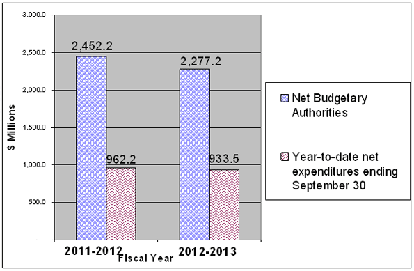 Graph 3: Comparison of Net Budgetary Authorities and Net Expenditures for Statutory Authorities as of September 30, for fiscal years 2011-12 and 2012-13