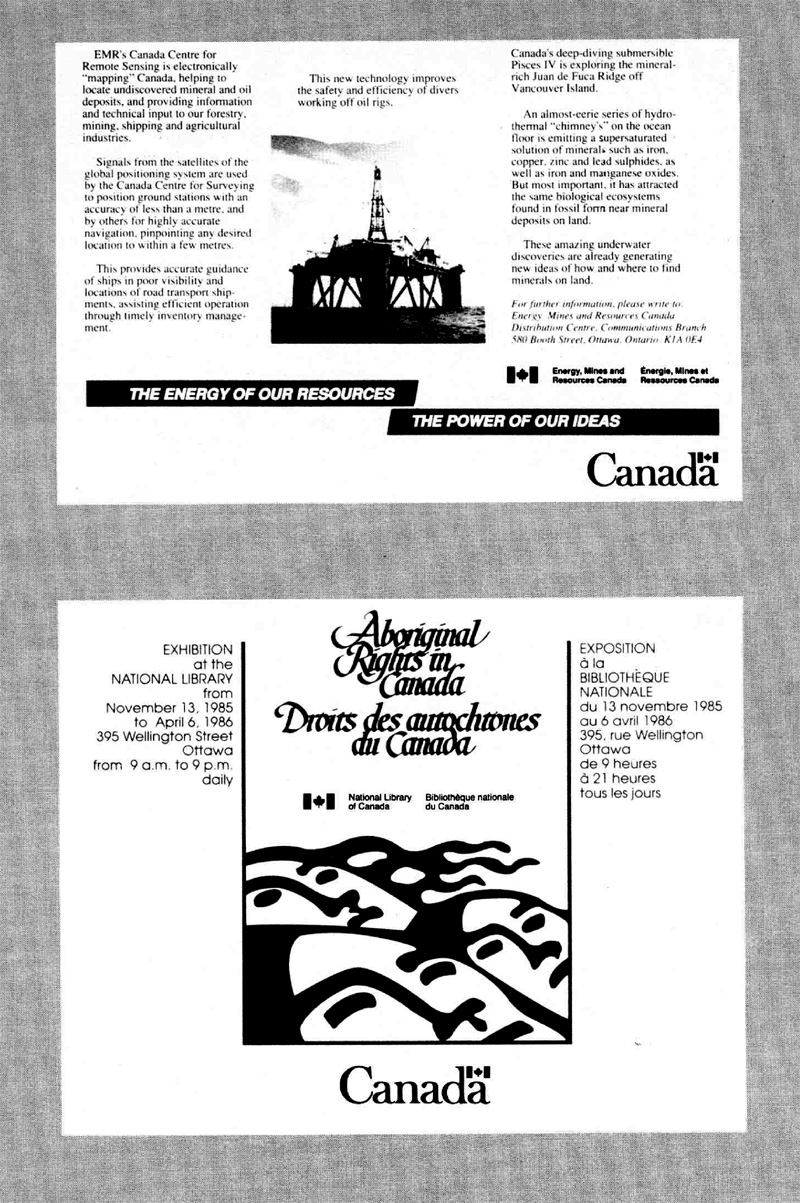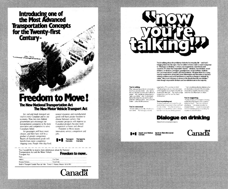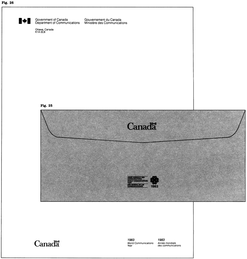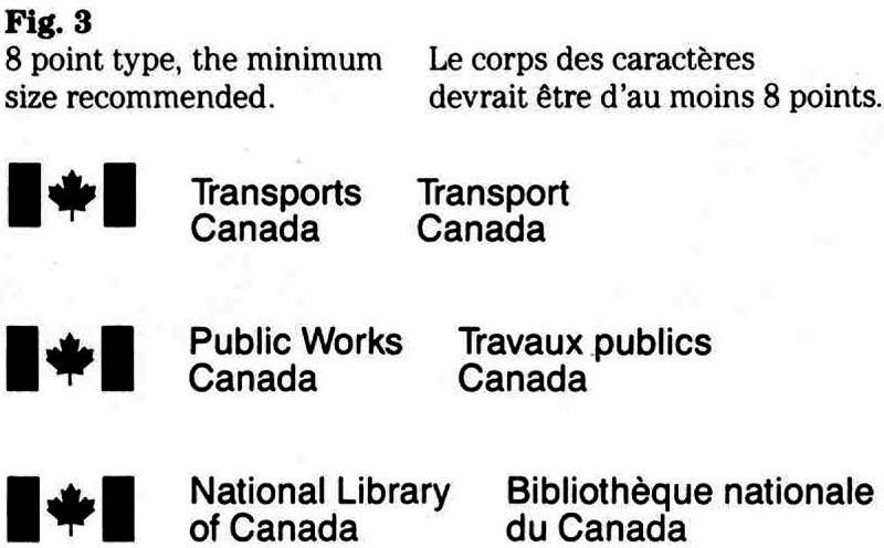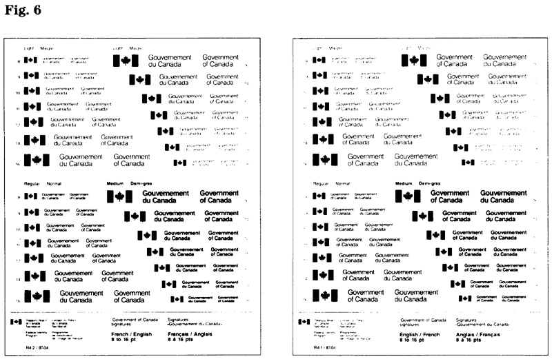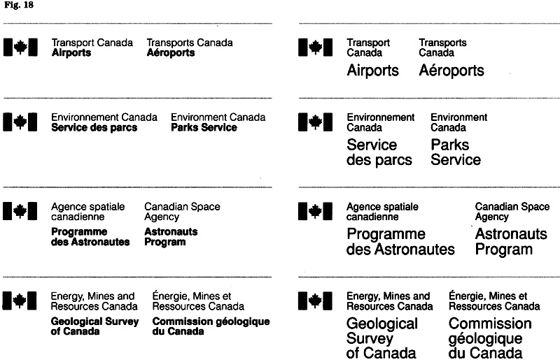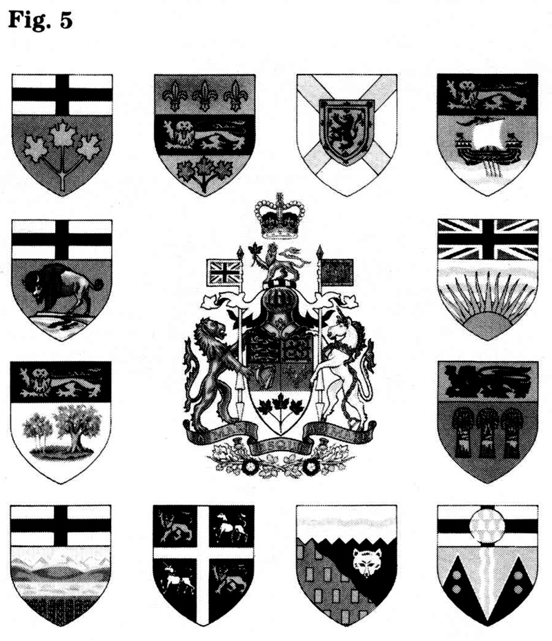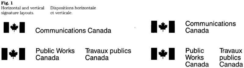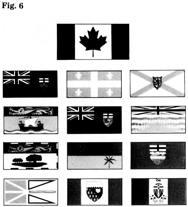 Where applicable, coats of arms, shields or flags may be used in lieu of the corporate identifiers that are normally employed. This applies particularly when provincial and territorial governments need to be identified in conjunction with the federal government. For example, a layout incorporating the federal Coat of Arms and the shields of the provinces and territories is well suited to portray the relationship of the governments (Fig. 5). A similar effect. may be achieved by using the different flags (Fig. 6).